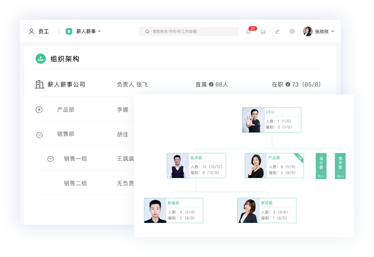 支持拖拽式批量調整組織架構,可按部門(mén)/崗位等維度