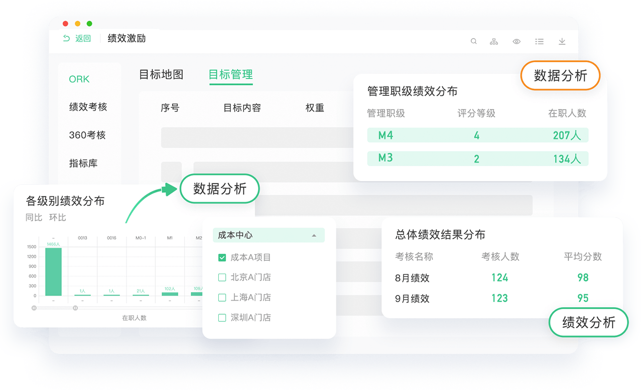 綜合看板,效果反饋,員工能力分析,組織架構分析